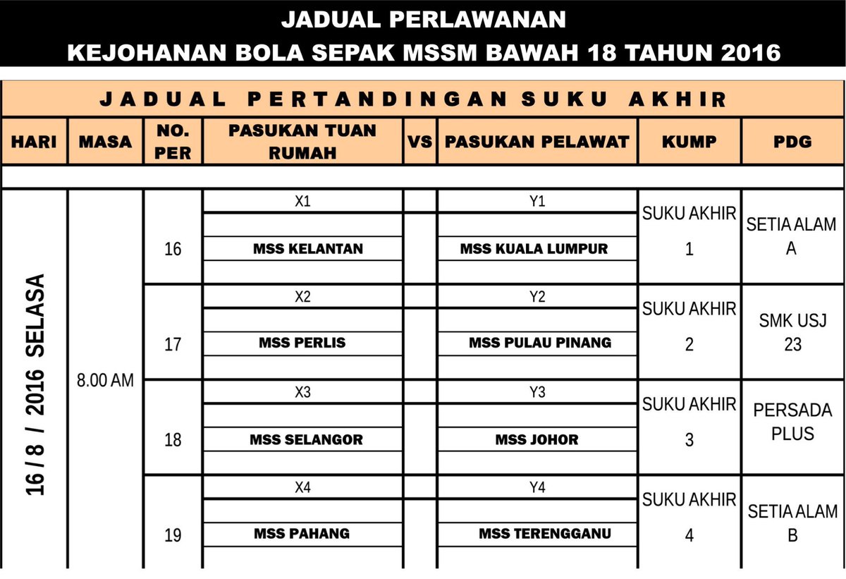 Permainan sepak bola sudah menjadi salah satu olahraga yang populer dan banyak sekali peminatnya di indonesia, jadi tidak heran jika bisa dengan mudah kita jumpai tempat pelatihan selain itu ada banyak juga kompetisi sepak bola yang di adakan, baik itu di tingkat kabupaten, kota maupun nasional. Jadual dan keputusan perlawanan melibatkan round of 16. Savesave jadual perlawanan bola sepak zon selatan 2018 for later. Selain definisi sepak bola diatas, ada beberapa pendapat beberapa ahli mengenai pengertian sepak bola. Jadual liga super dan liga premier malaysia 2020 sambungan liga yang akan dimulai pada 26 ogos 2020 sehingga 23.