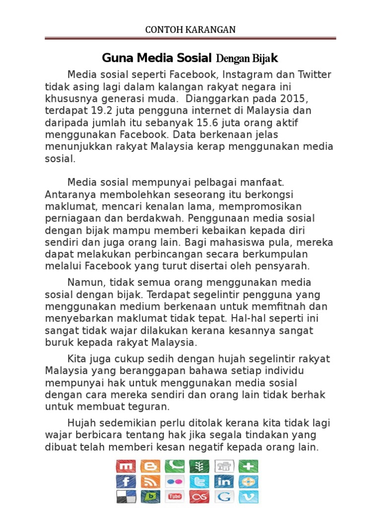 Media Sosial Pengertian Dampak Jenis Dan Manfaat Bagi Bisnis from www.sekawanmedia.co.id Sosial media adalah sebuah media untuk bersosialisasi satu sama lain dan dilakukan secara online. Dewasa ini maraknya media sosial yang bermunculan diinternet yang menjadi konsumsi semua lapisan masyarakat.sebahai bukti bahwa teknologi semakin canggih segala sesuatu dapat diaplikasikannya terutama media sosial yang online yang dapat secara langsung dan live dikonsumsi. Setiap hari, ada platform dan fitur baru yang bermunculan. Laporan kajian globalstat mendapati, lebih 72 peratus penggunaan media sosial di malaysia. Arrie widhayani 4 months ago. Statistik yang diambil daripada koleksi rencana umum untuk rujukan karangan spm & stpm yang ditulis oleh hj. Lebih lanjut mereka menyatakan bahwa berbagai definisi media. Karangan non ilmiah adalah karangan yang mengungkapkan fakta tentang pengetahuan serta pengalaman dalam kehidupan, biasanya cerpen banyak dijumpai di beberapa media cetak, serta media elektronik yang memungkinkan pembaca untuk mudah menikmati dan menjadikannya sumber.