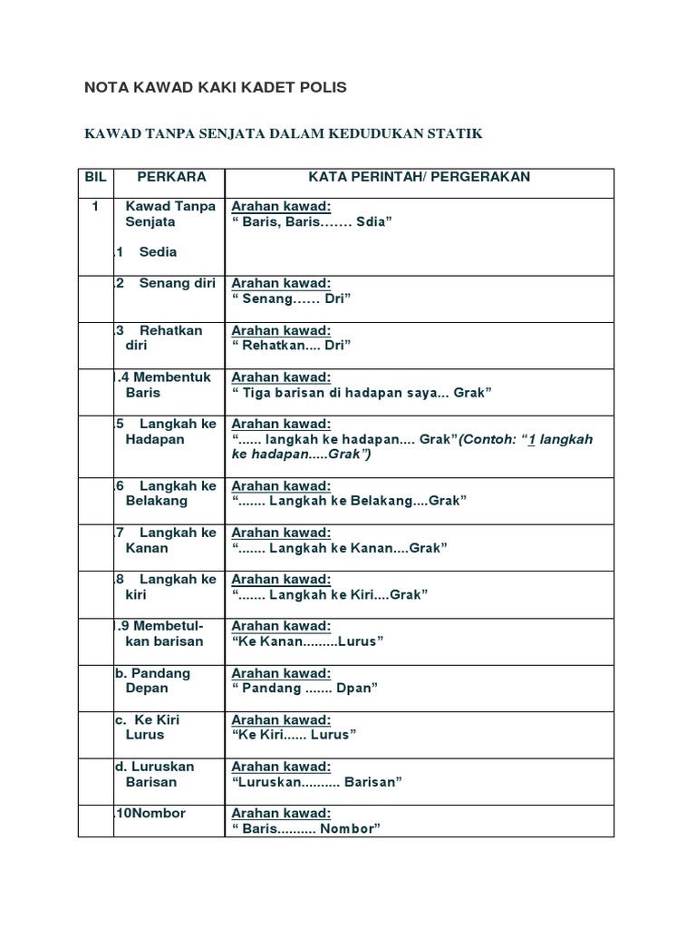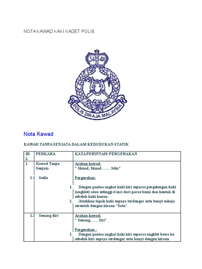 Kata Arahan Kawad Ylyxj7ow3qnm from idoc.pub Johan pertandingan kawad kaki (p) peringkat kebangsaan (zon selatan) 2013 (sekolah rendah). Pertandingan kawad kaki berpasukan kadet polis peringkat negeri 2014 daerah temerloh. Kawad kaki kadet polis smkip 2015. Encik salleh bin abdul razak, guru pemimpin kadet polis smk taman daya 2011. Persembahan ambang merdeka (kadet polis) 2018. Kadet polis smjk chan wa juara go kebangsaan 2014 zon selatan. Jatuhkan tapak kaki supaya terdengar satu bunyi sahaja serentak dengan. Johanpertandingan kawad kaki zon ipoh 2007.