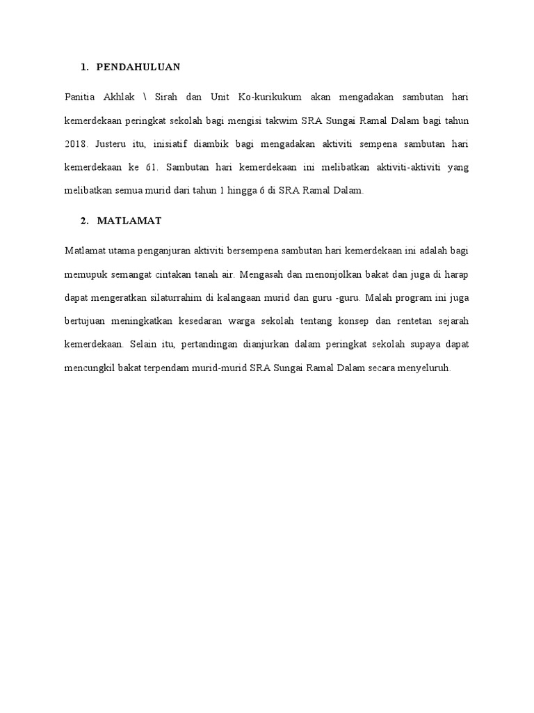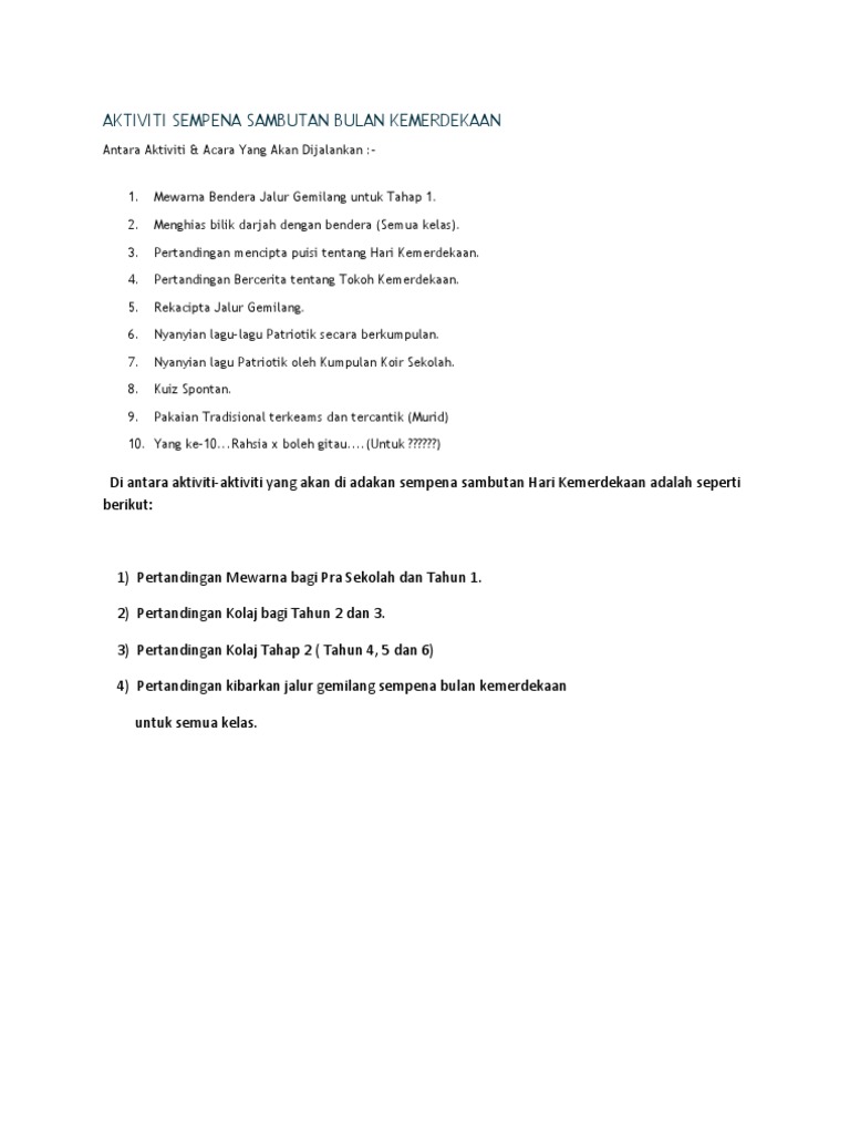 Kertas Kerja Sambutan Bulan Kemerdekaan 2020 New Normal Raihan Jalaludin S Blog from 1.bp.blogspot.com Persembahan dari tabika as syafa lagu 'warisan'. Sambutan ini berlangsung selari dengan tema iaitu 'gemilang negaraku, cemerlang universitiku'. Tajuk sambutan hari kemerdekaan pada tahun ini ialah 1 malaysia. Pelbagai aktiviti menarik disediakan kepada mahasiswa/mahasiswi untuk disertai. Gamuda land, unit hartanah milik gamuda bhd menawarkan pelbagai aktiviti di discovery park, gamuda cove bersempena sambutan hari kemerdekaan dan hari malaysia. Kelab staf psdc, dibawah biro kesenian & kebudayaan menganjurkan suatu pertandingan. Hari hari kemer kemerde dekaa kaan n nega negara ra yang yang kita kita sambu sambutt setia setiap p tahun tahun mempu mempuny nyai ai keba banyak aktiviti dan acara yang dipertandingkan sepanjang sambutan bulan kemerdekaan. Program ini bertujuan untuk memupuk semangat cintakan negara dalam diri mahasiswa/mahasiswi.